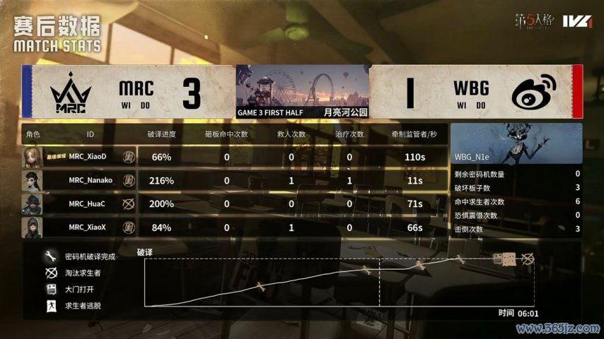 MRC的求生者选拔了病患、征象学家、“脱逃内行”、失火探听员(BAN歌剧演员);北京WBG的监管者N1e选拔了邦邦。(BAN空军、冒险家、哽噎懦夫、飘扬家)